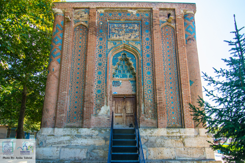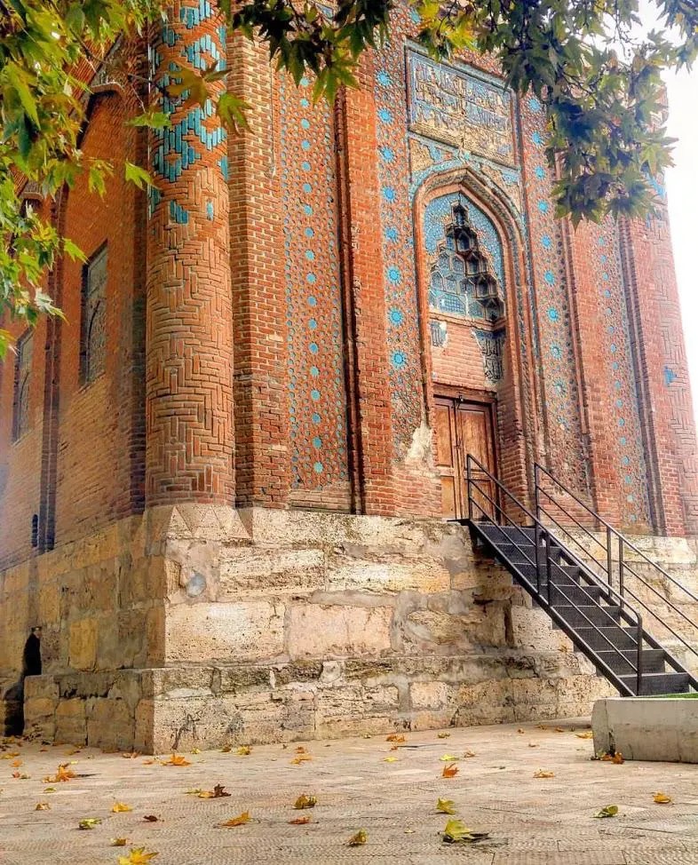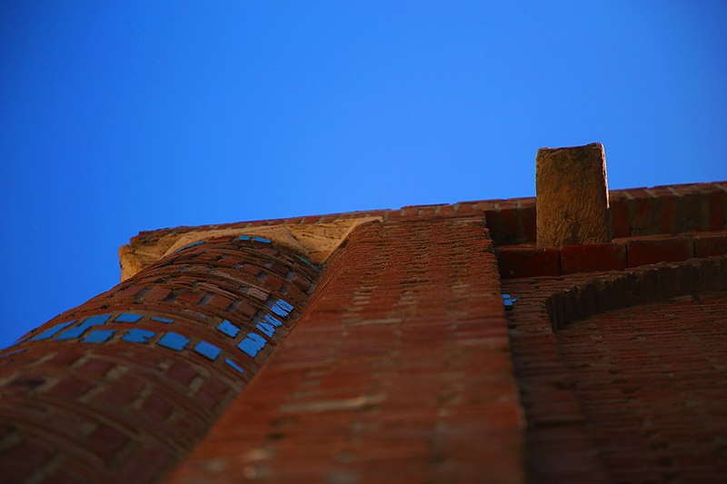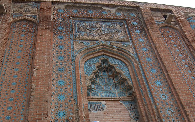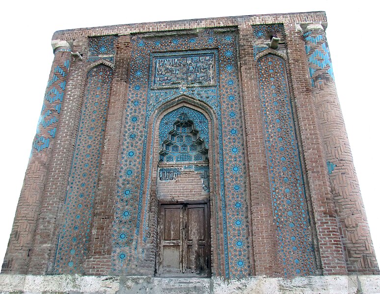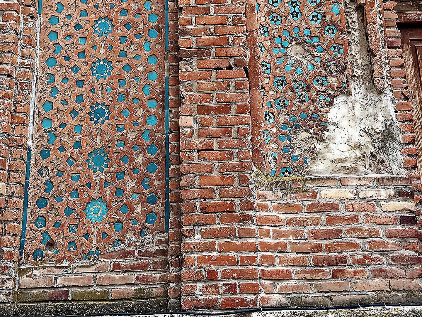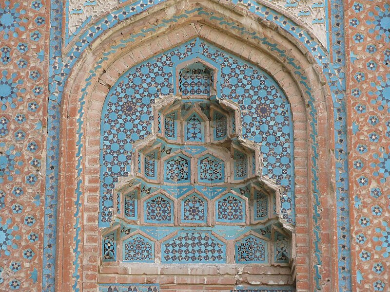 Στην κεντρική αψίδα, η διακόσμηση αποτελείται από συνδυασμό τούβλων και πλακιδίων σε μαύρο, λευκό και τιρκουάζ χρώμα. Δύο επιγραφές σε γραφή Ριχάν τοποθετούνται πάνω από την είσοδο, με μαύρα γράμματα σε λευκό φόντο, διακοσμημένα με τιρκουάζ φυτικά μοτίβα. Κάθε παράθυρο με ορθογώνιο πλαίσιο διακοσμείται με όμορφα σχέδια από τούβλα και πλακίδια μινάι.